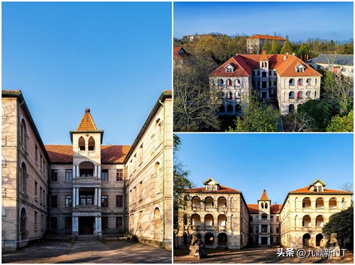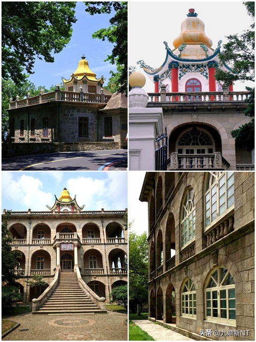 主楼3层、四方对称,顶部设有造型别致的中式覆钟塔亭