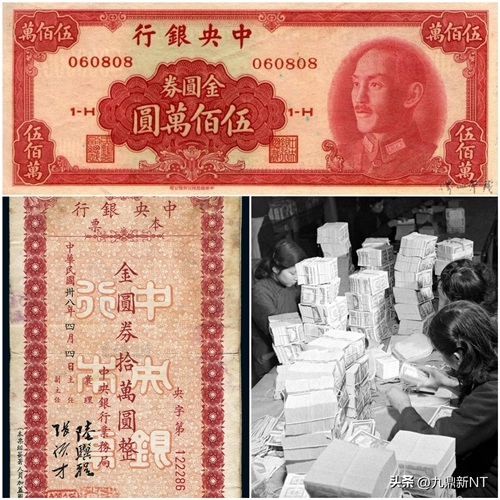上图为民国中央银行发行的500万元面值金圆券,由于滥发造成恶性通胀,流通不到一年,这些金圆券形同废纸