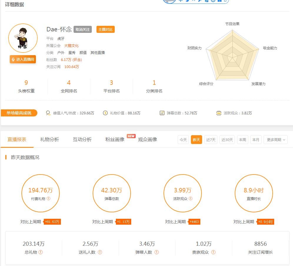 怀念是虎牙的知名主播,虽然是今年新加入虎牙,但是凭借着之前在熊猫的人气积攒,以及在户外直播板块浓厚的经验,很就在虎牙重新收获了一批新的粉丝,在最近的虎牙年度新势力比拼中,怀念也是取得了非常好的成绩。