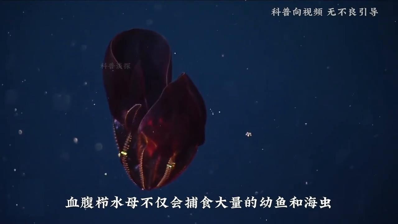 ·深海中一般很少会出现鲜艳的生物,但它绝对是个例外。血腹栉水母浑身呈血红色,好似一颗正在跳动的心脏,其实这是它害怕肚子里的食物发光,为了避免其它猎物感知到它的危险性,所以才进化成这样的颜色。而且它性情凶狠,食欲惊人。血腹栉水母不仅会捕食大量的幼鱼和海虫,甚至就连其他同类都不会放过。