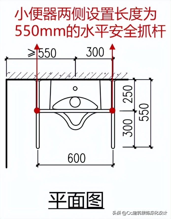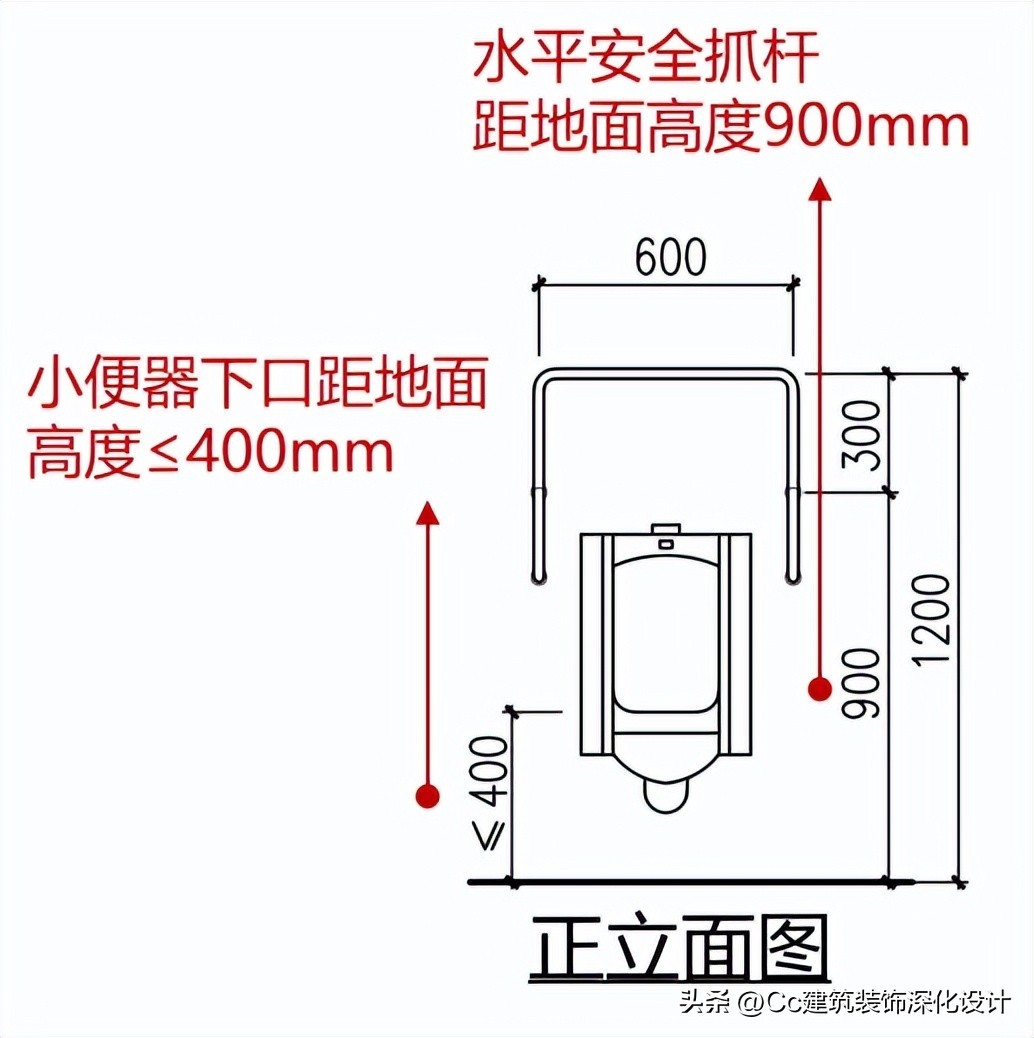 小便器下口距地面高度不应大于400mm;应在小便器两侧设置长度为550mm的水平安全抓杆,距地面高度应为900mm;应在小便器上部设置支撑安全抓杆,距地面高度应为1.20m。