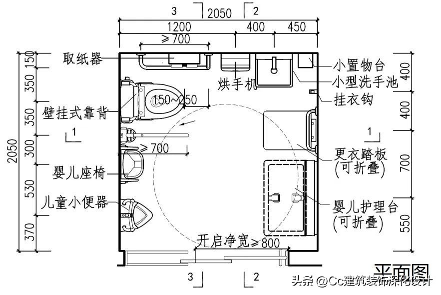 实际上其使用人群还包括老年人、病人、儿童、孕妇以及他们的陪同人员,等等。不同人群的身体状况和使用需求各异,如果仅考虑残障人士需求,往往并不能够方便所有人使用。例如,对于带着婴儿的母亲而言,一些无障碍卫生间中就缺少婴儿座椅,导致母亲在如厕时无法将婴儿妥善安置。因此,卫生间的无障碍设计应充分照顾到各类人群的使用需求,切忌以偏概全。