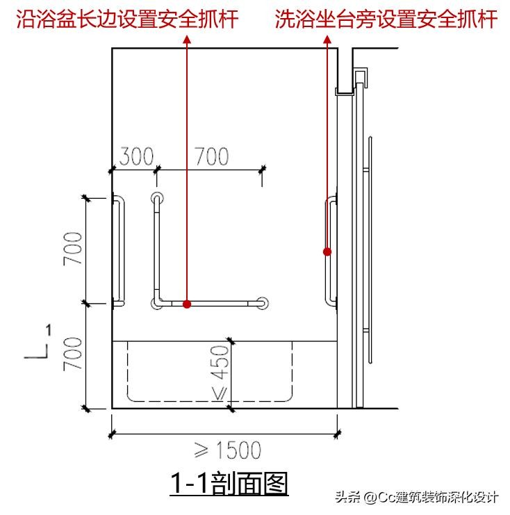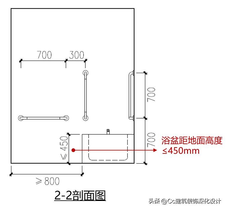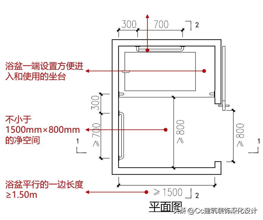 浴盆侧面应设不小于1500mm×800mm的净空间,和浴盆平行的一边长度不应小于1.50m;浴盆距地面高度不应大于450mm;在浴盆一端设置方便进入和使用的坐台;应沿浴盆长边和洗浴坐台旁设置安全抓杆。