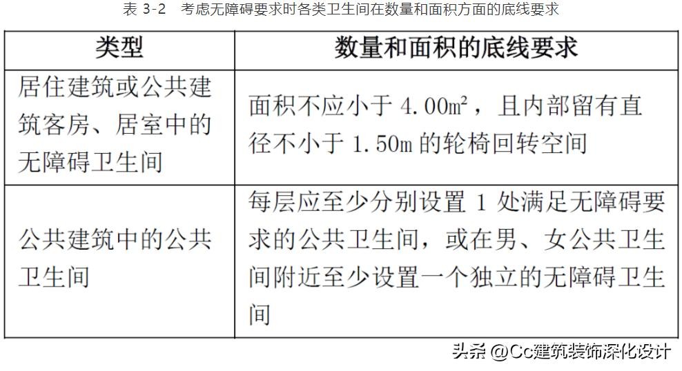 设计时,应根据所属建筑或场地的功能,以及使用者特征,合理配置卫生间的数量和面积。考虑无障碍要求时,卫生间的数量和面积应至少满足下表中的底线要求。