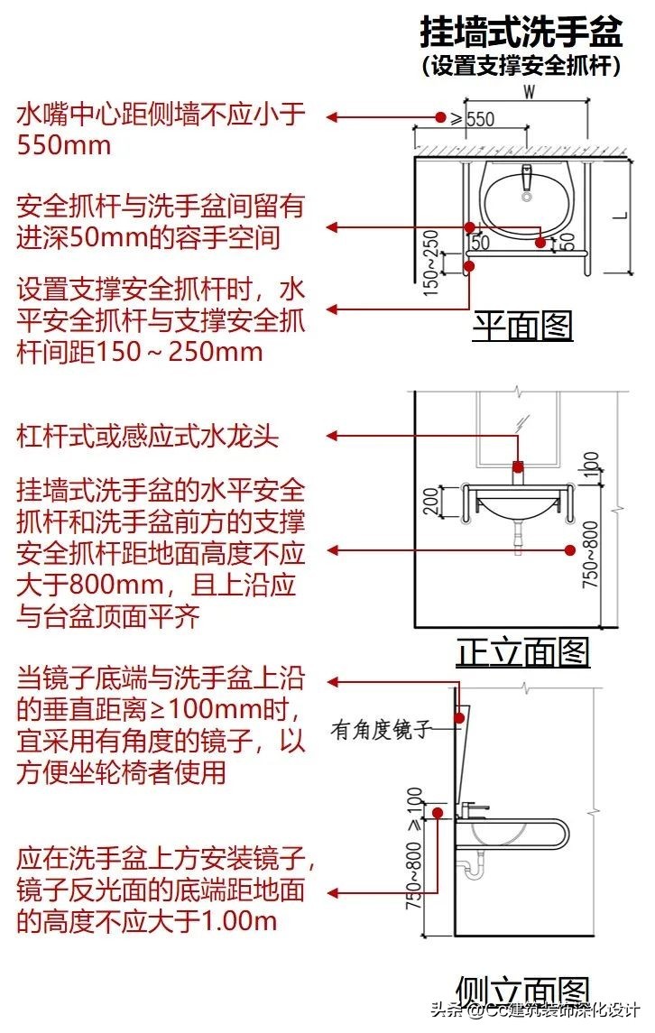 台面距地面高度不应大于800mm,水嘴中心距侧墙不应小于550mm,其下部应留出不小于宽750mm、高650mm、距地面高度250mm范围内进深不小于450mm、其他部分进深不小于250mm的容膝容脚空间;应在洗手盆上方安装镜子,镜子反光面的底端距地面的高度不应大于1.00m;当镜子底端与洗手盆上沿的垂直距离≥100mm时,宜采用有角度的镜子,以方便坐轮椅者使用;出水龙头应采用杠杆式水龙头或感应式自动出水方式;应在洗手盆两侧设置水平安全抓杆;挂墙式洗手盆的水平安全抓杆和洗手盆前方的支撑安全抓杆距地面高度不应大于800mm,且上沿应与台盆顶面平齐,并与洗手盆间留有进深50mm的容手空间;