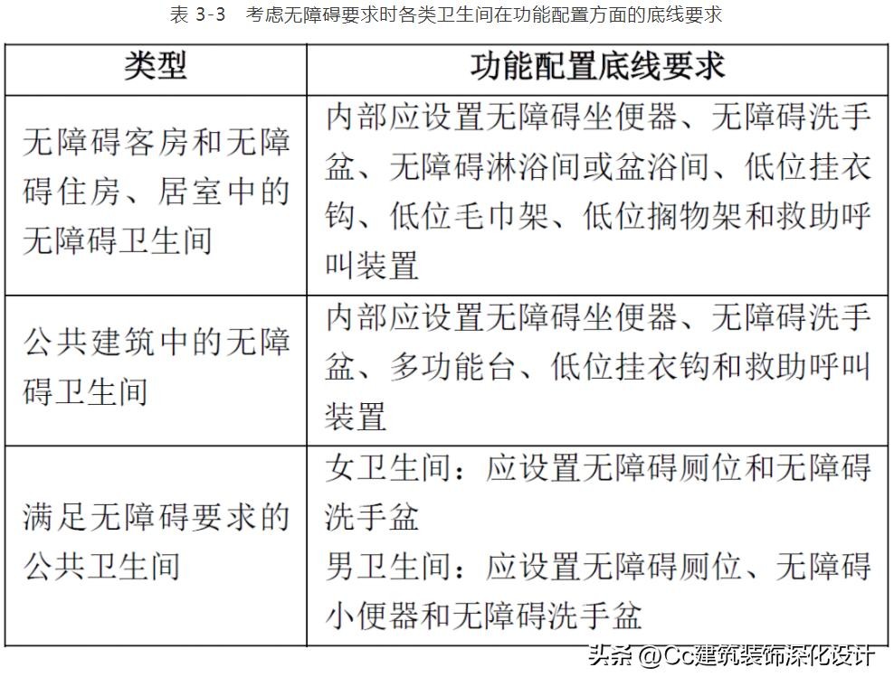 设计时,应根据使用人群的需求配置功能齐全的用房空间和设施设备。考虑无障碍要求时,卫生间的功能配置应至少满足以下底线要求。