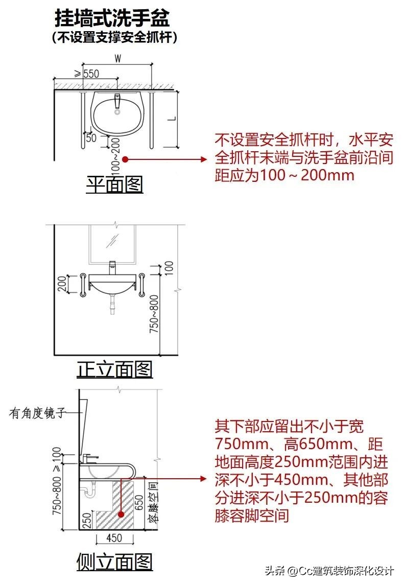 设置支撑安全抓杆时,水平安全抓杆末端与支撑安全抓杆间距应为150~250mm;不设置安全抓杆时,水平安全抓杆末端与洗手盆前沿间距应为100~200mm;