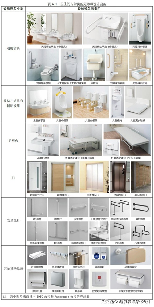 在卫生间的无障碍设计当中,设计师需要根据使用人群的需求特征对卫生间内的设施设备进行配置,常用的设施设备如下表所示。