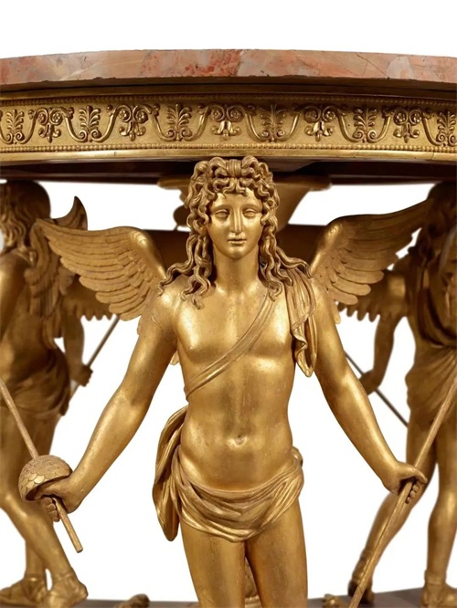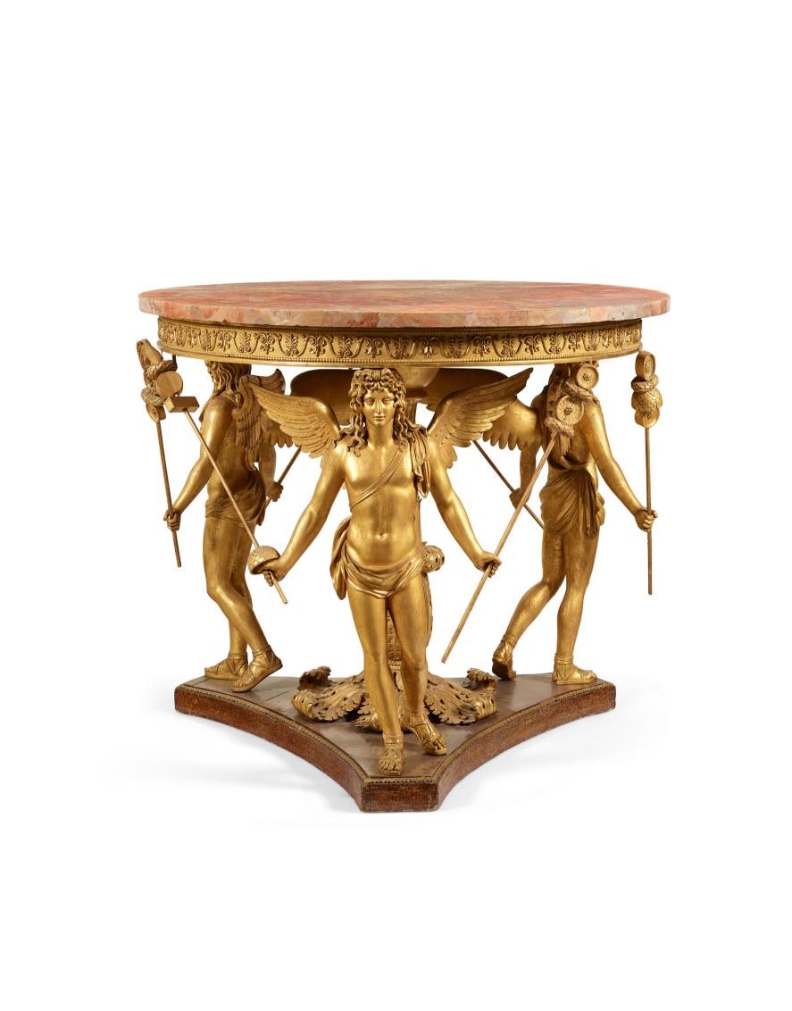 Lorenzo Santi和Dionisio Santi制作的帝政风桌子,大理石台面和木制支撑轴,底部是三个镀金的配备长矛的天使形象/约1803-06年/成交价478,800欧元