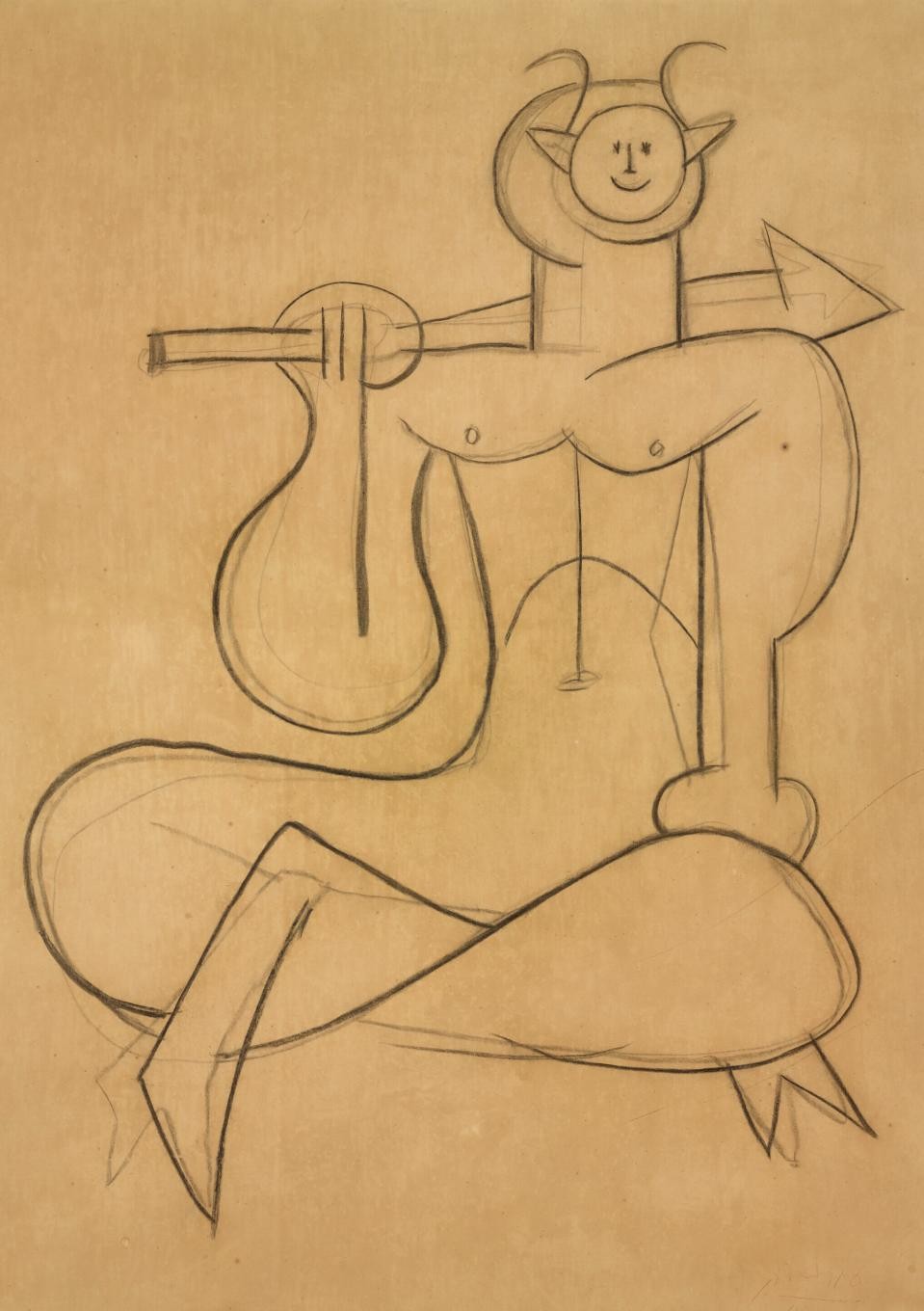 雕塑对面的墙上挂着毕加索的大型粉笔画《带着长矛的牧羊人》1947/(右下)安东尼·塔皮斯《无题》1977/(左下)毕加索《Faunes et Tete de Femme》1946