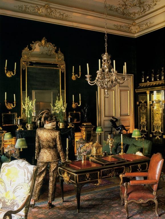 18世纪的重工刺绣爬满了窗帘、座椅和地毯,一座来自钢琴家米希亚的布勒镶嵌衣橱紧靠着墙边。古典隽永的鎏金版面上勾勒着阿波罗的传说。纪梵希曾一遍遍地轻抚它,叹息道:“我会在这座衣橱前做梦。”