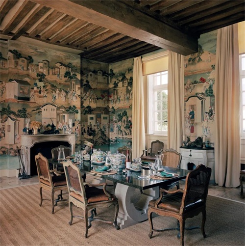 连绵不断的“中国风”场景布满了墙面,Charles Sevigny设计的餐桌上摆放着与墙面相衬的瓷器餐具,和波西米亚玻璃杯碰撞出别样的异域风情。