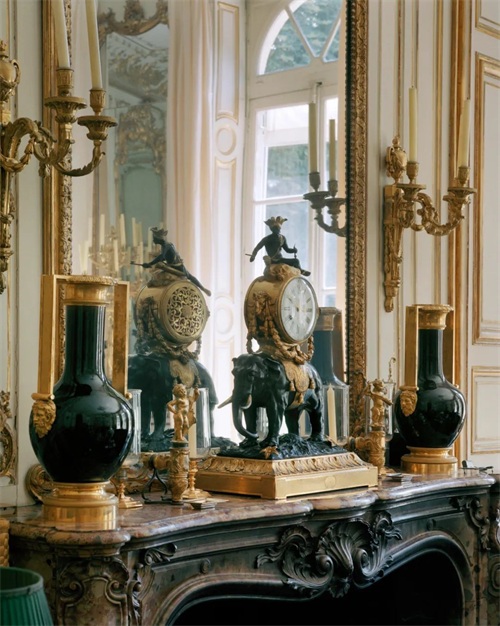 壁炉上,曾经属于可可·香奈儿的路易十五大象青铜纪念时钟,体现了这两位艺术家同样高雅的品味。