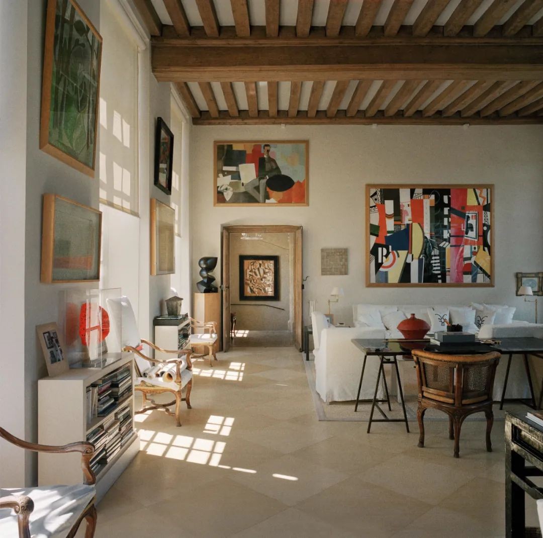 房间正中间的沙发上,挂着纪梵希和韦内一起创作的拼贴画,这两位职业里充满了色彩的艺术家,也愿携手将他们的生活和家中都染上他们独有的色彩。