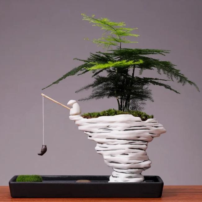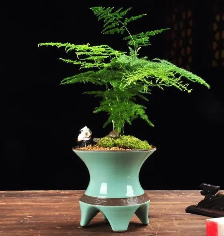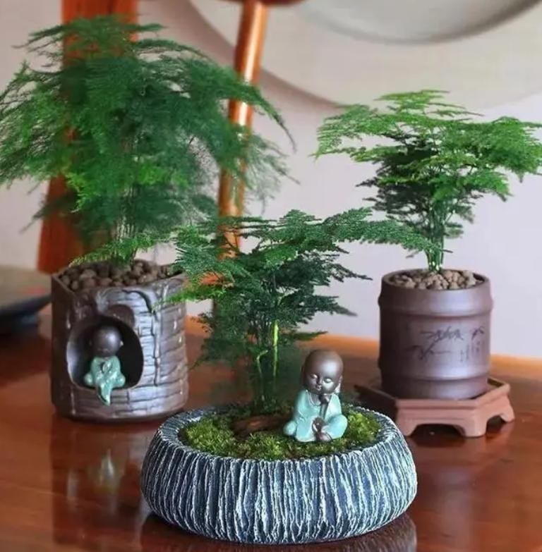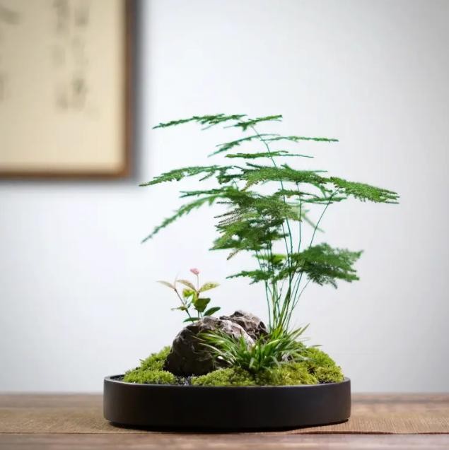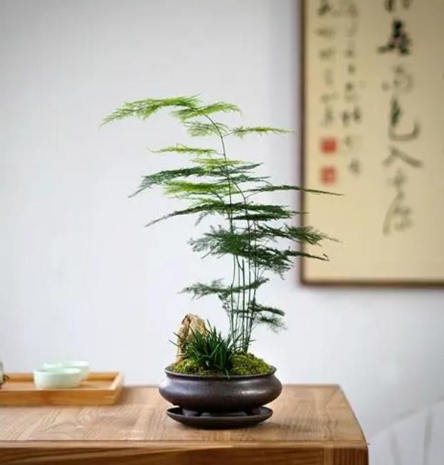 因为,文竹自带文人气息,纤细柔美,姿态飘逸,文雅大方,非常适合养在家中。特别是摆放在茶台或书房中,自带风骨,能突显中式典雅的风格,具有“竹报平安”的寓意。