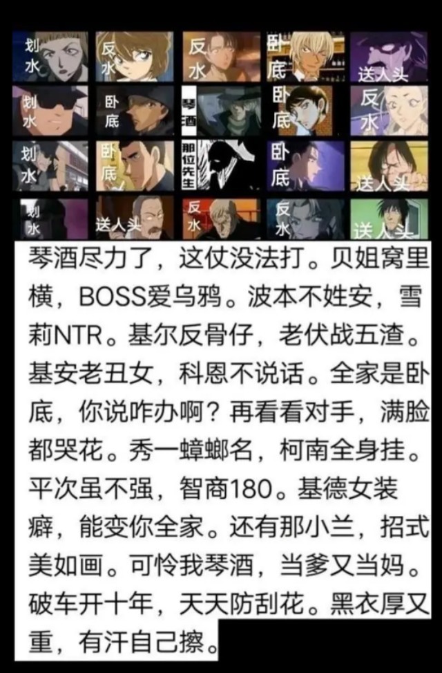 再看看对方,柯南全身挂,还有国际警察的围追堵截,除了这些外,“酒厂”的幕后老大也没有出现过,感觉整个酒厂都是自己在运行的,于是好好的“酒厂”变成了“水厂”,除了老琴一直为组织卖命外,其他人好像一直都游离在组织外,本以为整个“酒厂”就只有几滴水原来是整个“酒厂”只有琴酒一滴酒,琴酒表示很无奈