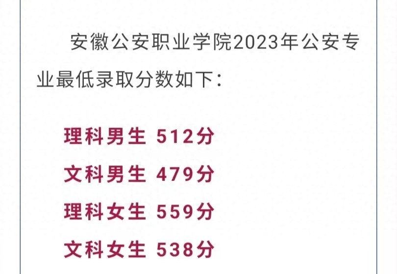 7月17日下午,安徽公安职业学院今天公布了其今年的录取分数线,没有最高,只有更高!今年的录取分数线达到了一个新高度:男生理科512分,文科479分;女生理科559分,文科538分。