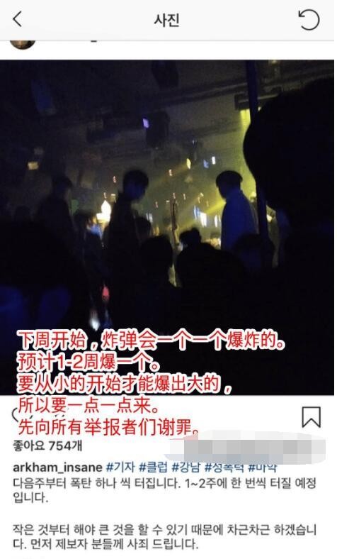 而李胜利夜店事件爆出的记者ins刚刚发表了令人惶恐的博文:下周开始,炸弹会一个一个爆炸,预计一两周爆一个,要从小的开始才能爆出大的。看来韩国娱乐圈是要开始大变天了吧。不知道已经牵扯到其中的艺人们是不是已经开始坐立不安了呢?那么中国内地是否有艺人也牵扯到其中,我们只能拭目以待了吧。