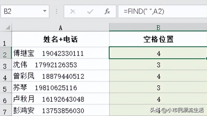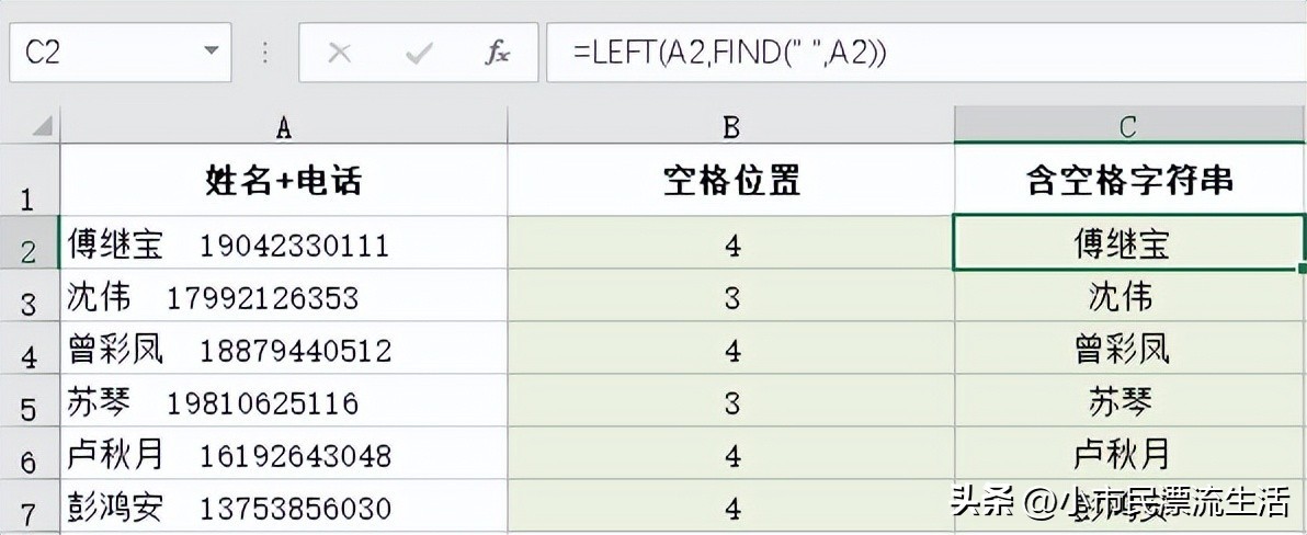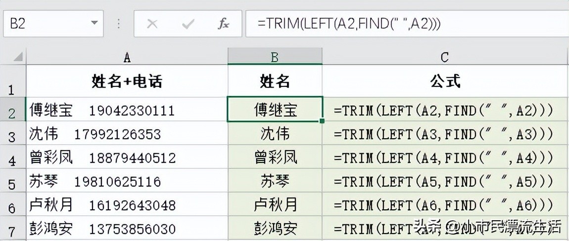 在B2单元格输入公式 =TRIM(LEFT(A2,FIND(" ",A2))) ,然后将公式填充至B7单元格,B列单元格中就是获取到的A列姓名+电话字符串中的姓名了。