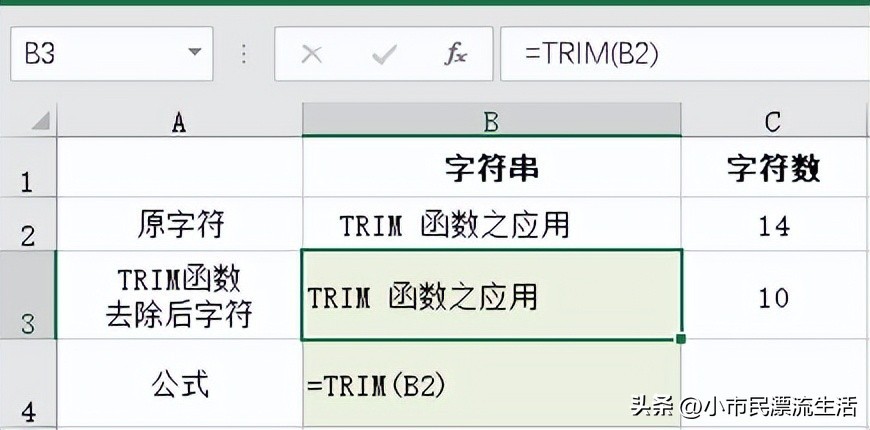 如下图 原B2单元格字符串* TRIM 函数之应用 *共计14个字符(字符串前后各有2个空格、字符之间有1个空格),经过TRIM函数公式 =TRIM(B2) 运算去除前后空格后,最终B3单元格*TRIM 函数之应用*字符串只有去除首尾空格后的10个字符了。