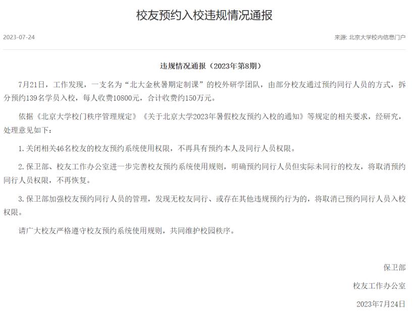 多知网 7 月 25 日消息,日前,北京大学发布校友预约入校违规情况通报。据介绍,7 月 21 日,工作发现,一支名为 " 北大金秋暑期定制课 " 的校外研学团队,由部分校友通过预约同行人员的方式,拆分预约 139 名学员入校,每人收费 10800 元,合计收费约 150 万元。
