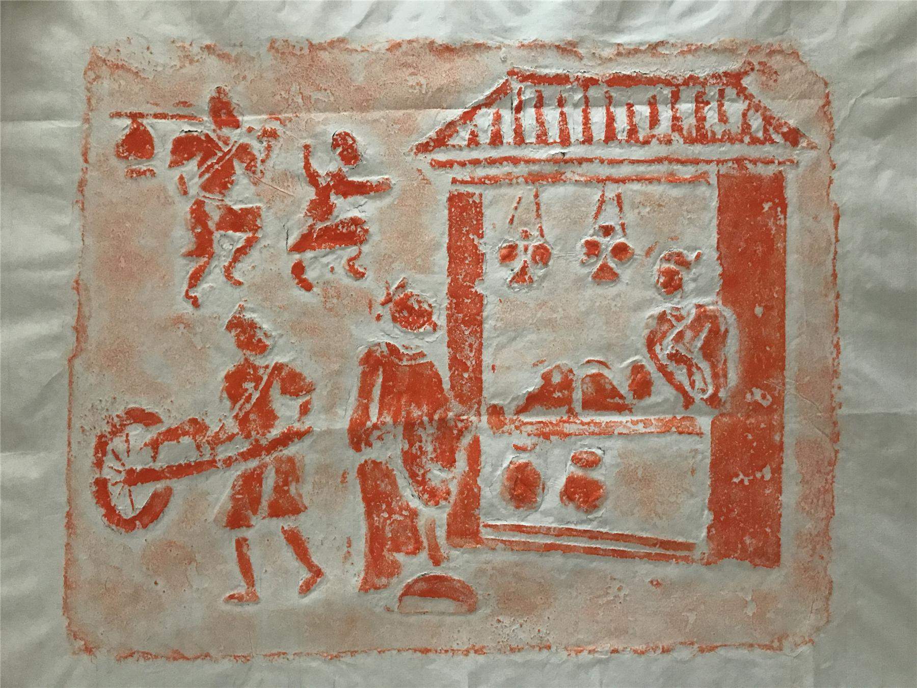 笔者藏汉画像砖拓片《集市图》,近景中一人推车,一人卖肉,一人当街而立,酷似民间传说中刘关张相遇时的情景