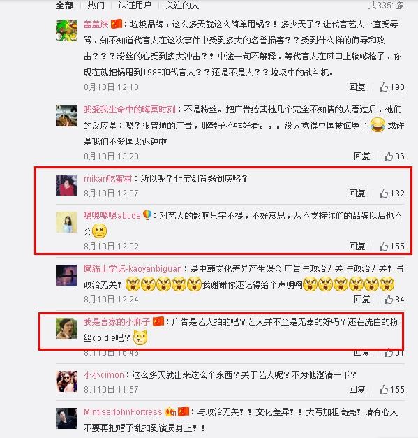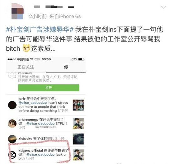 该则广告在中国网络曝光后引爆了国人怒火,朴宝剑的中国粉丝因此跑到INS求真相,没想到却遭遇了疑似朴宝剑工作室辱骂。虽然有很多网友表示对朴宝剑很失望,但仍有不少人拼命为自己的欧巴洗白,称朴宝剑没有ins也没有工作室,然而只是朴宝剑方面始终未有回应。