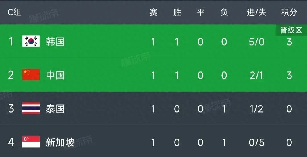 韩国队:以出色的表现,他们以5-0的大胜,位居积分榜首的位置!中国队:通过2-1的逆转胜利,他们成功登上榜单第二的位置!
