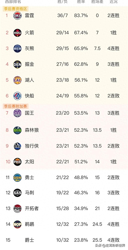 NBA西部排名又乱了 雷霆斩落爵士 火箭险胜骑士 国王17分逆转勇士