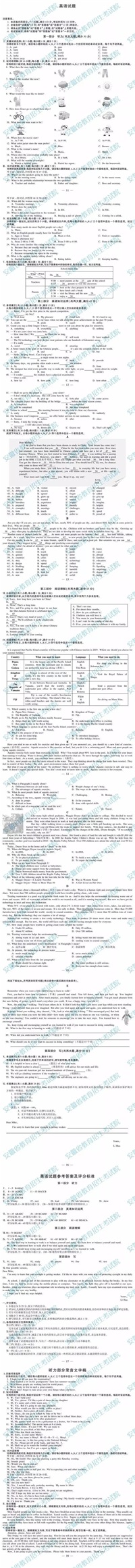 英语试题参考答案及评分标准