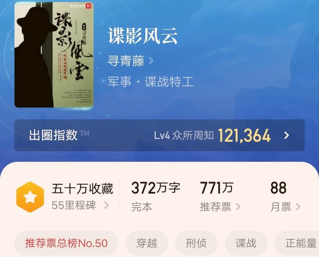 似乎有段时间没扫榜了,今天看到手机里寻青藤新作《北国谍影》的闪屏截图,才想起来看看。看下来,寻青藤还是厉害的,旧作《谍影风云》完结后一直保持着军事分类畅销冠军。