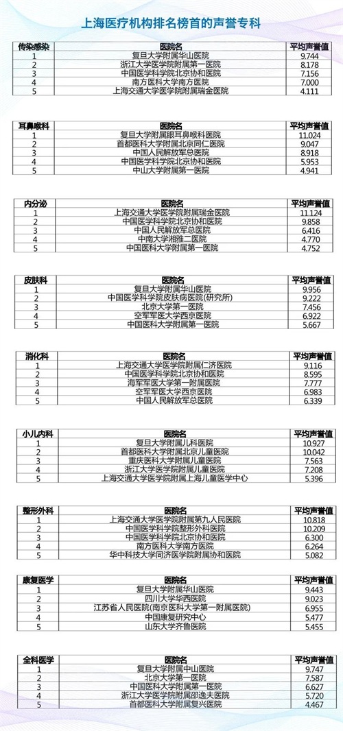 而在42个专科类排行榜上,上海有9个专科排名全国第一。分别是:华山医院的传染感染科、皮肤科、康复医学科;第九人民医院的整形外科;瑞金医院的内分泌科;五官科医院的耳鼻喉科;仁济医院消化病科;复旦附属儿科医院的小儿内科;以及中山医院的全科医学。