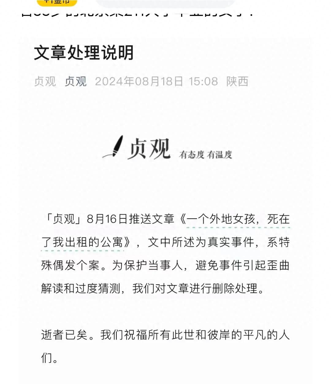 近日,公众号贞观发表了一篇33岁陕西女孩饿死在出租屋内的新闻,在文章中作者以出租屋房东的身份叙述了女孩临终前后的事。把女孩介绍成211高材生,多次考公笔试第一名却面试不通过,因为怀才不遇、社会不公含恨而死。这样的文章内容足够吸引眼球,但是经过调查,除了女孩离世是真的,其他信息几乎都不属实。