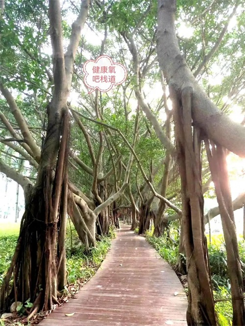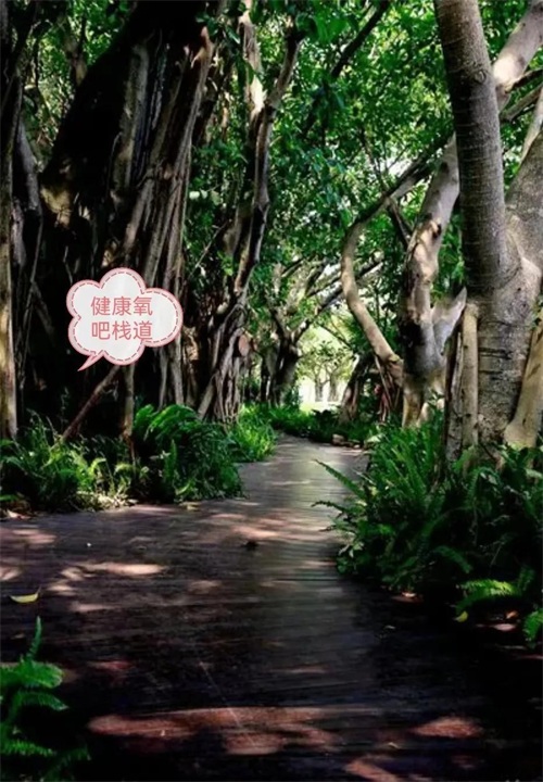 临近人工湖的是健康氧吧栈道,栈道两旁怪树林立,林木成荫,栈道全程有2000多米,像一条绿色的长廊,是一个天然的大氧吧。
