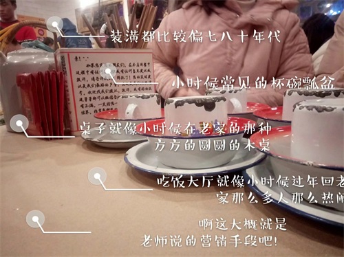老三样的服务很温馨,她不会说“欢迎光临”而是“欢迎回家”。每个服务人员都会穿红色的制服,热情但不似火。老三样的的布局 还原七八十年代的生活场景,这里有红包牌纸巾、大公鸡茶壶、搪瓷碗、搪瓷杯~