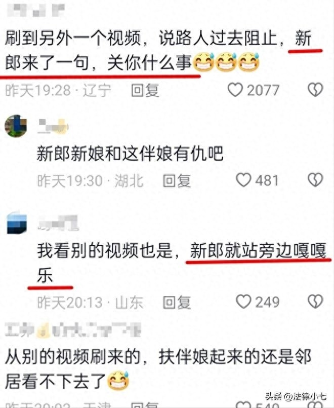 这段视频在网络上发布后引发了网友的热议。一些网友先是指责拍摄视频的人,认为他们在现场目睹着伴娘被几名男士凌辱,为何不上前救助她?
