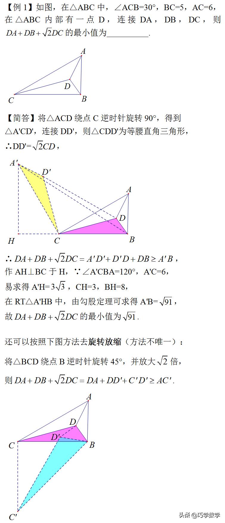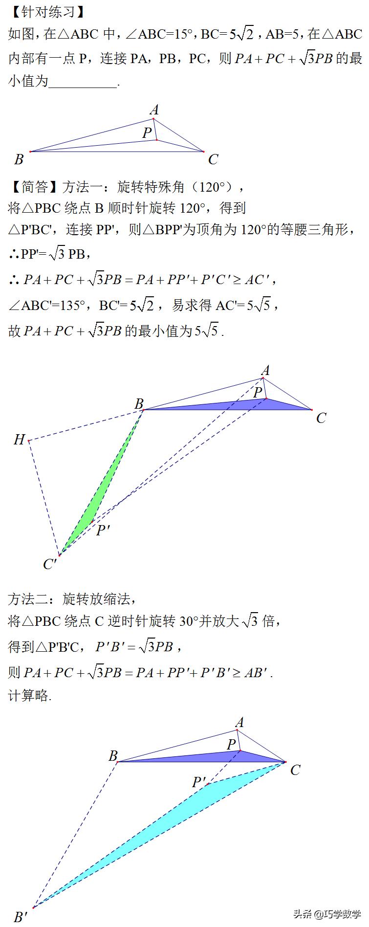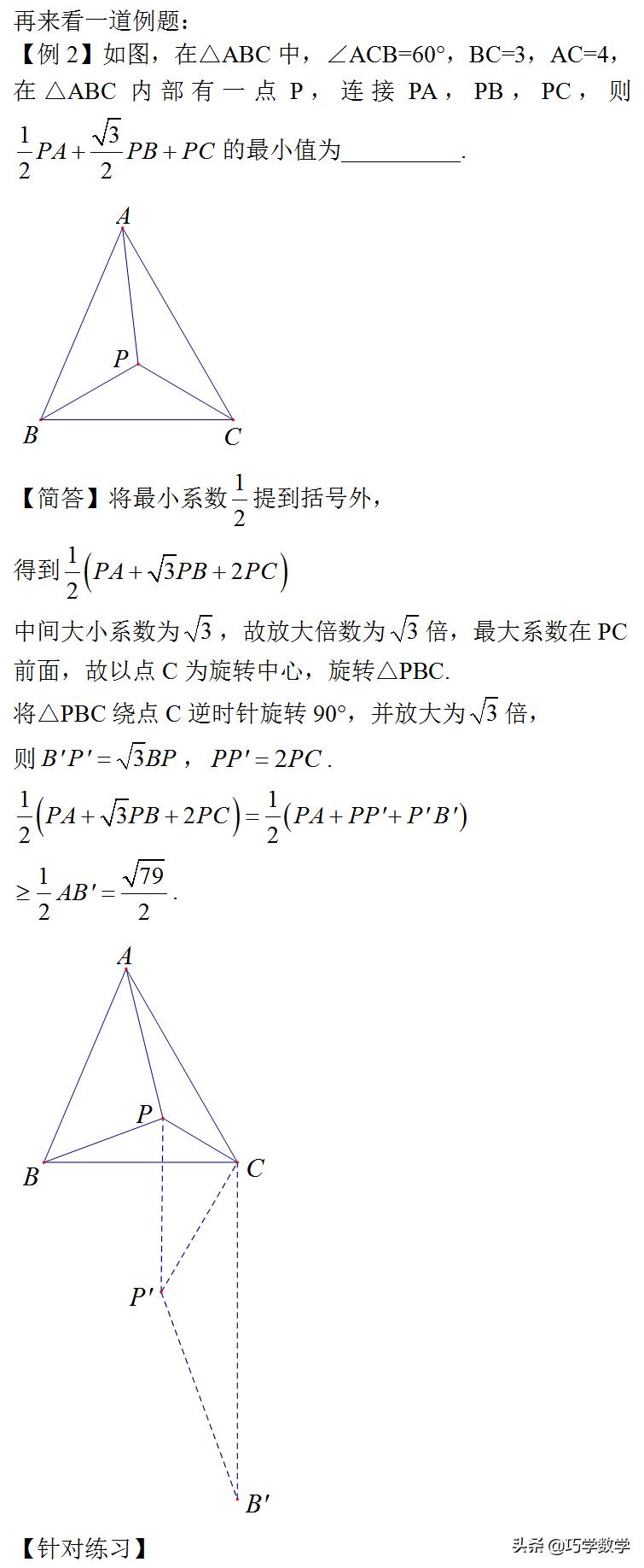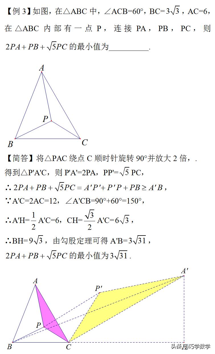 对于费马点问题,大家已经见得比较多了,相信都能熟练解决,如果所求最值中三条线段的系数有不为1的情况,我们把这类问题归为加权费马点问题,解决方法类似,也是通过旋转进行线段转化,只不过要根据系数的情况选择不同的旋转或放缩方法。