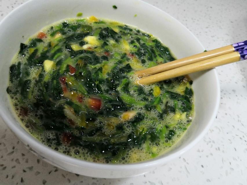 第四步:把切好的蒲公英、切好的彩椒放到鸡蛋液里再搅拌均匀。