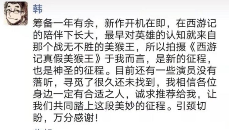 不过就在12月2日,一则消息却震惊了网友。导演韩延在朋友圈发文,表示要拍摄电影《西游记真假美猴王》,而且还邀请了六小龄童、马德华两人以动作捕捉演员的身份再次饰演孙悟空和猪八戒。