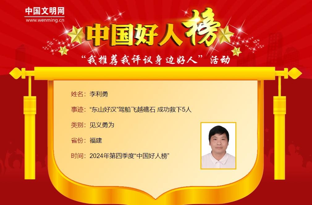 李利勇,男,1983年9月生,福建省漳州市帆船帆板协会会长,国家帆船帆板队退役运动员。2024年春节期间,正与家人团聚的李利勇接到群众来电:“金紫荆附近小岛上有人被困了,快来救人!”李利勇一听,二话不说喊来2名队员,带上救生设备前往群众受困地点进行解救,最终5名被困人员全部获救。李利勇曾获“2018年度感动福建十大人物”提名奖、福建青年五四奖章等荣誉。