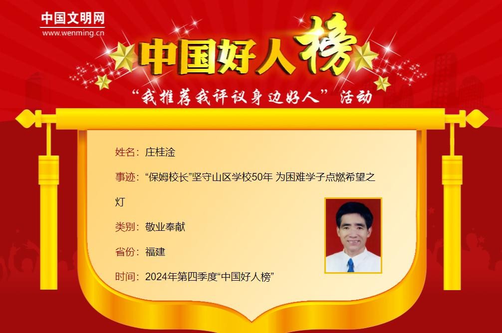 庄桂淦,男,1957年7月生,中共党员,福建省南平市政和县西津畲族小学校长。庄桂淦是印尼侨眷,1974年,他响应“支援山区教育”的号召,毅然从沿海侨乡到闽北贫困山区支教,扎根贫困县政和,一干就是50年。他始终坚守在农村教育教学一线,他的教学工作以及学校的管理工作在政和县学校中名列前茅。在庄桂淦的守护下,近2000名山区儿童茁壮成长,奔向大山外的世界。