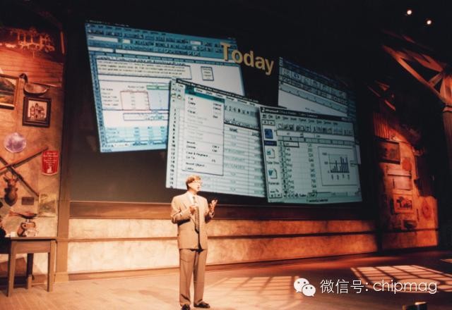 比尔盖茨展示Office 95,该版Office只支持32位操作系统。