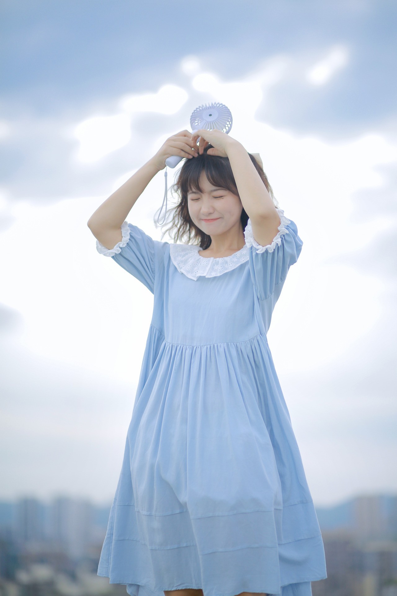 只拍半身的情况下,可以是一些抬手、举手、手放头顶等有助于在视觉上拉长身材比例的姿势,像下图的模特一般,抬手放于头上比心,甜美又可爱。