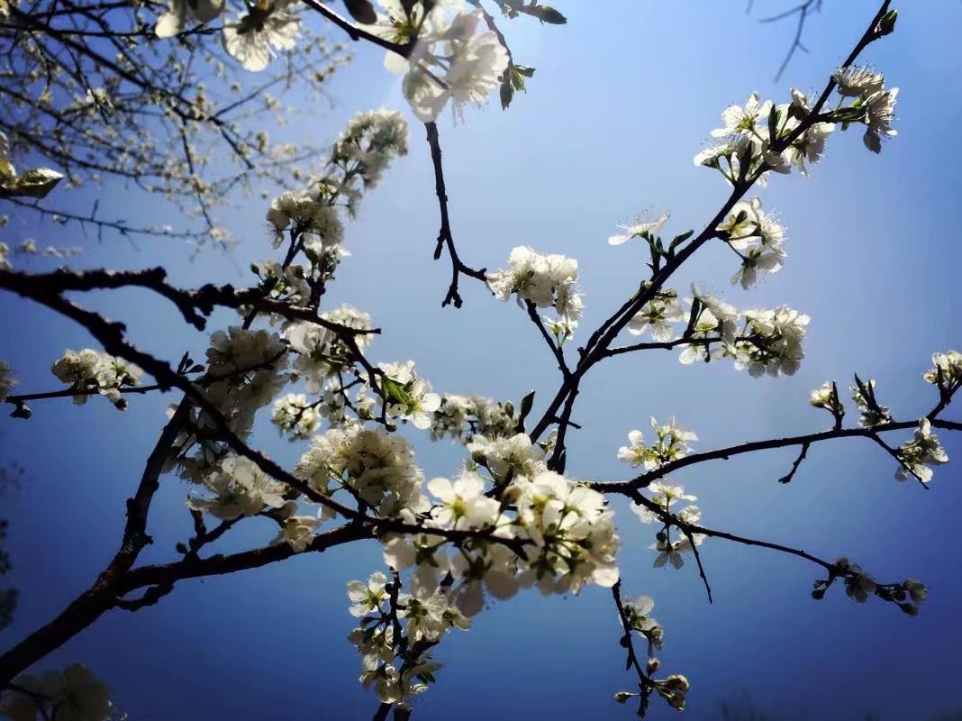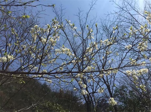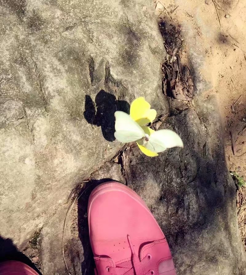 峡谷边上石缝里长出的树已经开出洁白的花朵,这是一棵杏树还是一棵李子树,我也分不清,只是觉得这洁白的花朵,在蓝天白云绿树的掩映下特别的美,就连小蝴蝶都忍不住跑过来采花粉,而且蝴蝶居然不怕人,还想往我脚上飞,可能把我这粉红色的鞋子当成一朵花了吧。