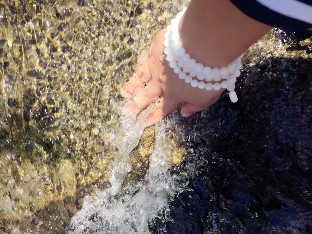 沿着景区的小路继续往前走,就能看到瀑布,洁白的瀑布像绸缎一样从山上飘落下来,然后变成了宝石般的颜色,这样的瀑布第一次见,瀑布虽然不高,但是哗啦啦的水流声也是很远就能听见。