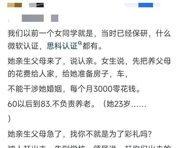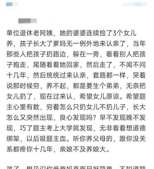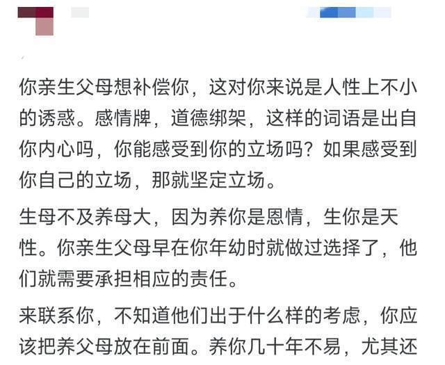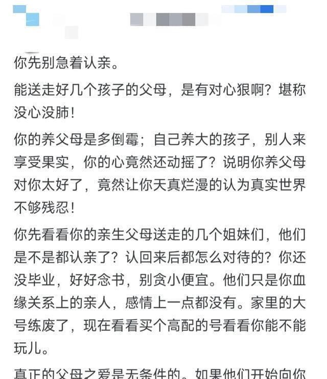 此外,还有网友认为,亲生父母的行为可能会给孩子带来心理负担。他们担心孩子会陷入矛盾和痛苦之中,不知道如何选择。因此,他们建议孩子要慎重考虑,要懂得感恩,要站在自己的立场上做出选择。