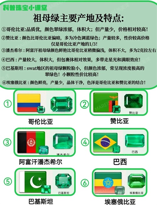 · 在国际市场上,最常见的祖母绿来自哥伦比亚、巴西和赞比亚。