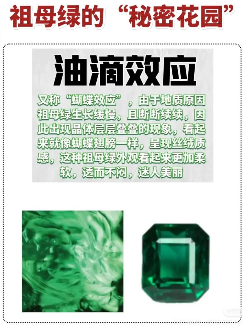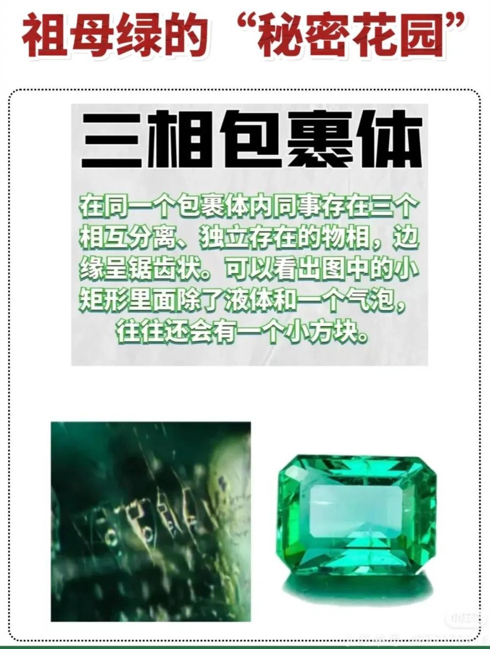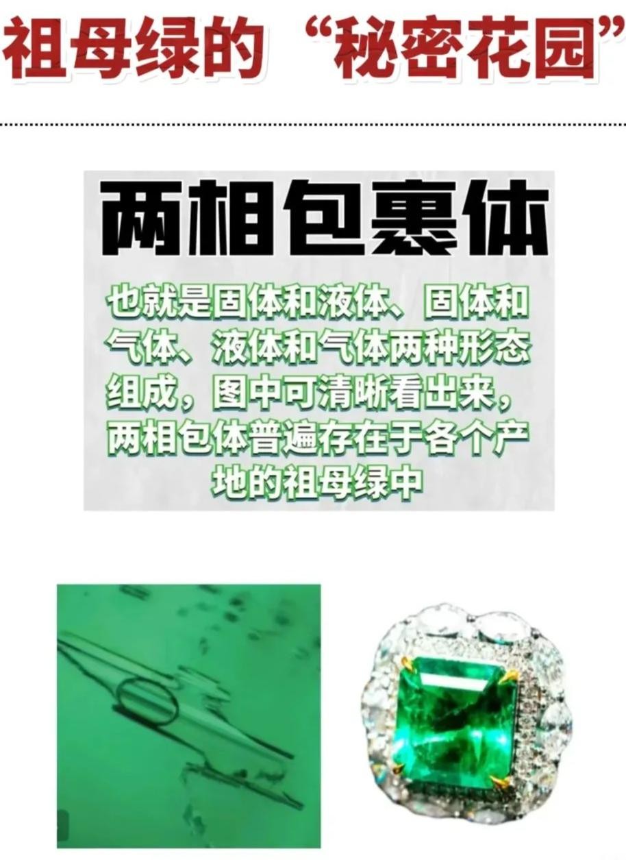 · 祖母绿中的各种包裹体(如液体、气体)以及神奇的“泡泡”、“荧光点”等构成了其独特的“秘密花园”。