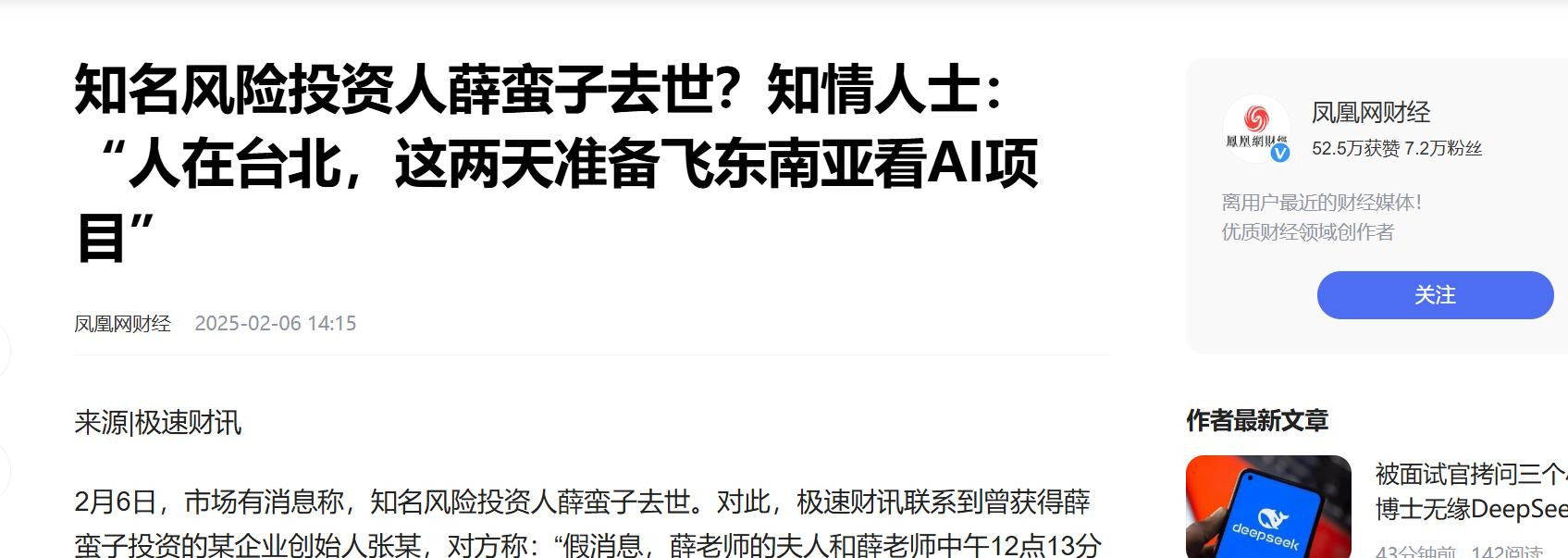 凤凰网财经2025-02-06-《知名风险投资人薛蛮子去世?知情人士:“人在台北,这两天准备飞东南亚看AI项目”》