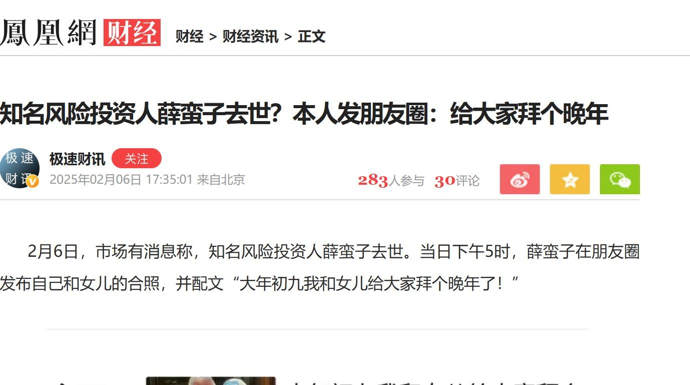 凤凰网财经-2025-02-06-《知名风险投资人薛蛮子去世?本人发朋友圈:给大家拜个晚年》